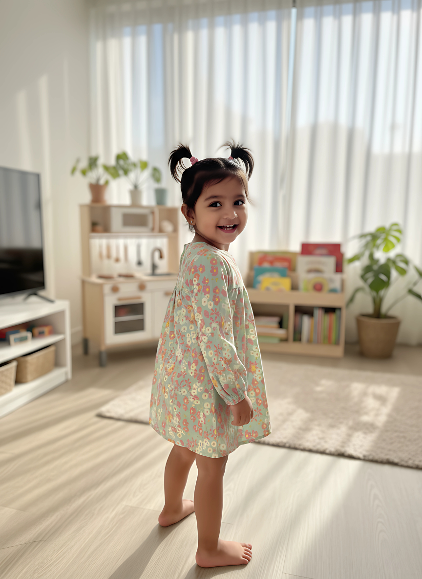 Bring a splash of colors to your little one’s wardrobe with our Blooming Garden Button-Down Dress. Crafted from soft, breathable cotton, this dress is designed for all-day comfort and play. The vibrant oversized floral print adds a cheerful charm, while the front button closure makes it easy to wear. The gathered yoke and slightly puffed 3/4th sleeves with elasticated cuffs give it a playful yet stylish silhouette.
