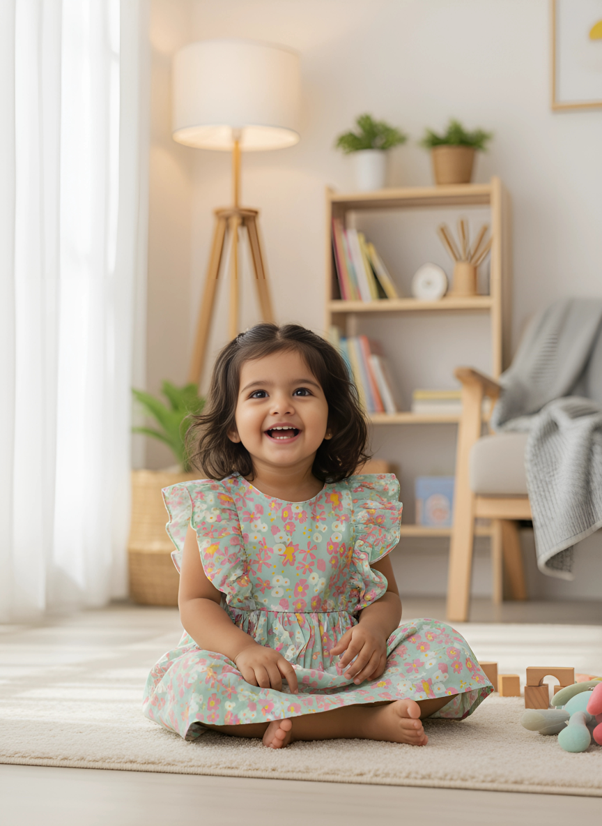 The Floria Frill Dress is a burst of joy wrapped in florals, designed to make your little one shine with every step. With its cheerful mix of colours, this dress brings a fresh, summery vibe perfect for everyday play or special occasions. The fluttery frill sleeves add a charming girly touch, while the gathered waistline ensures a twirl-worthy silhouette. Crafted from soft, breathable cotton, it promises all-day comfort whether she’s at a picnic, a birthday party, or simply giggling her way through the day.